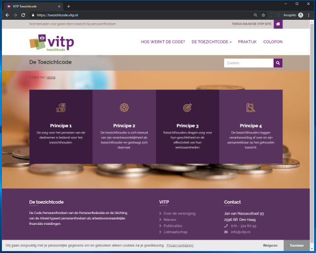 Website voor VITP over het intern toezicht en de ontwikkeling van Pension Fund Governance. Daartoe heeft de VITP zich ontwikkeld tot het expertisecentrum voor intern toezichthouders in de pensioensector. De beroepsvereniging heeft het normenkader voor goed intern toezicht bij pensioenfondsen online gepubliceerd.